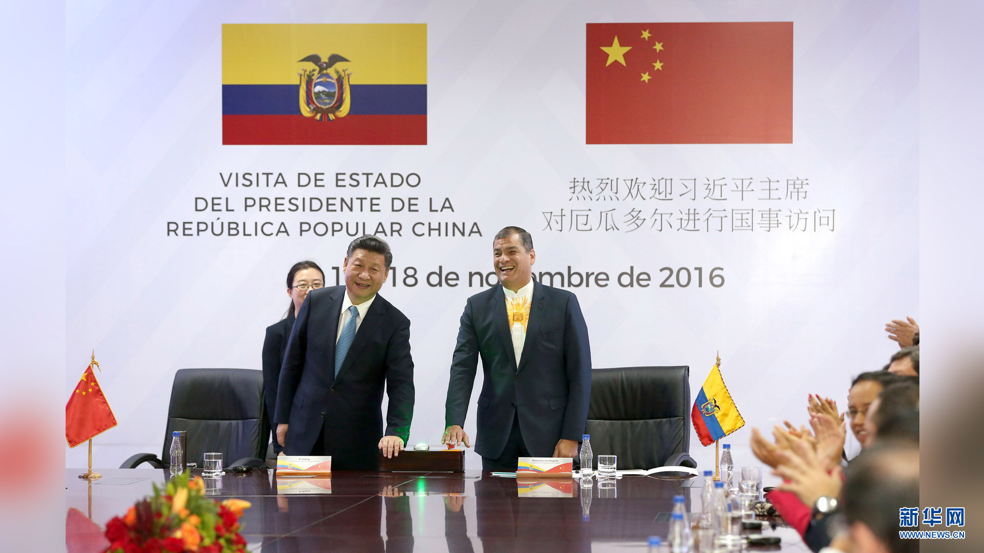 當(dāng)?shù)貢r(shí)間11月18日,國家主席習(xí)近平在基多同厄瓜多爾總統(tǒng)科雷亞共同出席中方援建的厄瓜多爾公共安全應(yīng)急指揮中心聯(lián)合實(shí)驗(yàn)室揭牌儀式,喬內(nèi)醫(yī)院奠基、科卡科多-辛克雷水電站竣工發(fā)電視頻連線活動(dòng)。這是兩國元首共同按動(dòng)按鈕,辛克雷水電站正式竣工發(fā)電。新華社記者 馬占成 攝2016-11-19