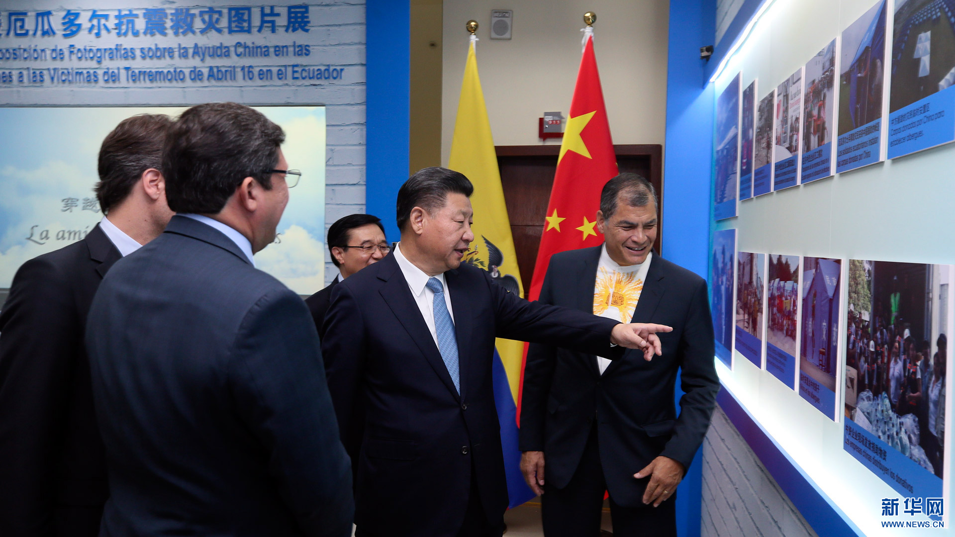 當(dāng)?shù)貢r(shí)間11月18日,國家主席習(xí)近平在基多同厄瓜多爾總統(tǒng)科雷亞共同出席中方援建的厄瓜多爾公共安全應(yīng)急指揮中心聯(lián)合實(shí)驗(yàn)室揭牌儀式,喬內(nèi)醫(yī)院奠基、科卡科多-辛克雷水電站竣工發(fā)電視頻連線活動(dòng)。這是兩國元首共同參觀中方支援厄瓜多爾抗震救災(zāi)圖片展。新華社記者 蘭紅光 攝2016-11-19