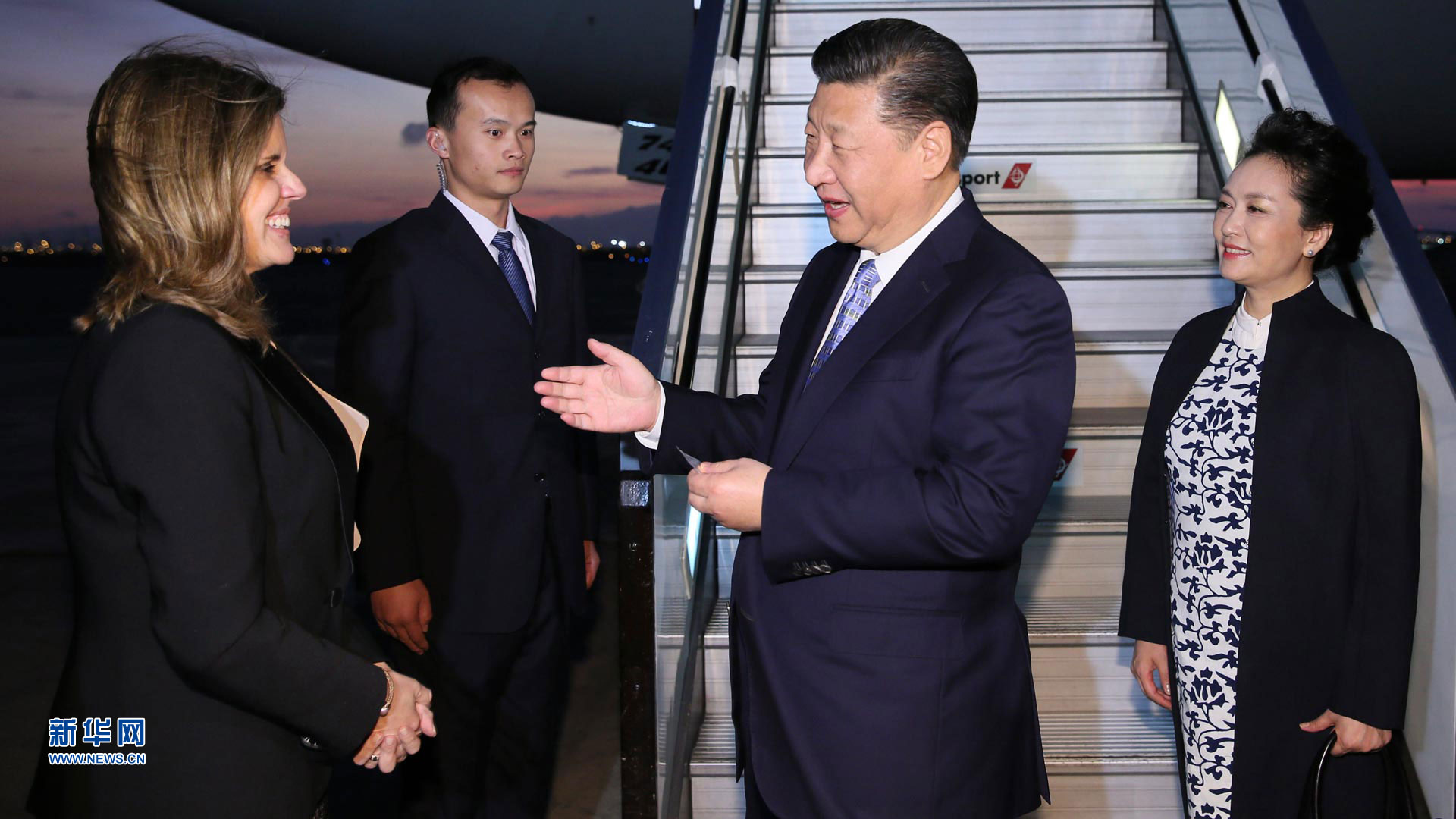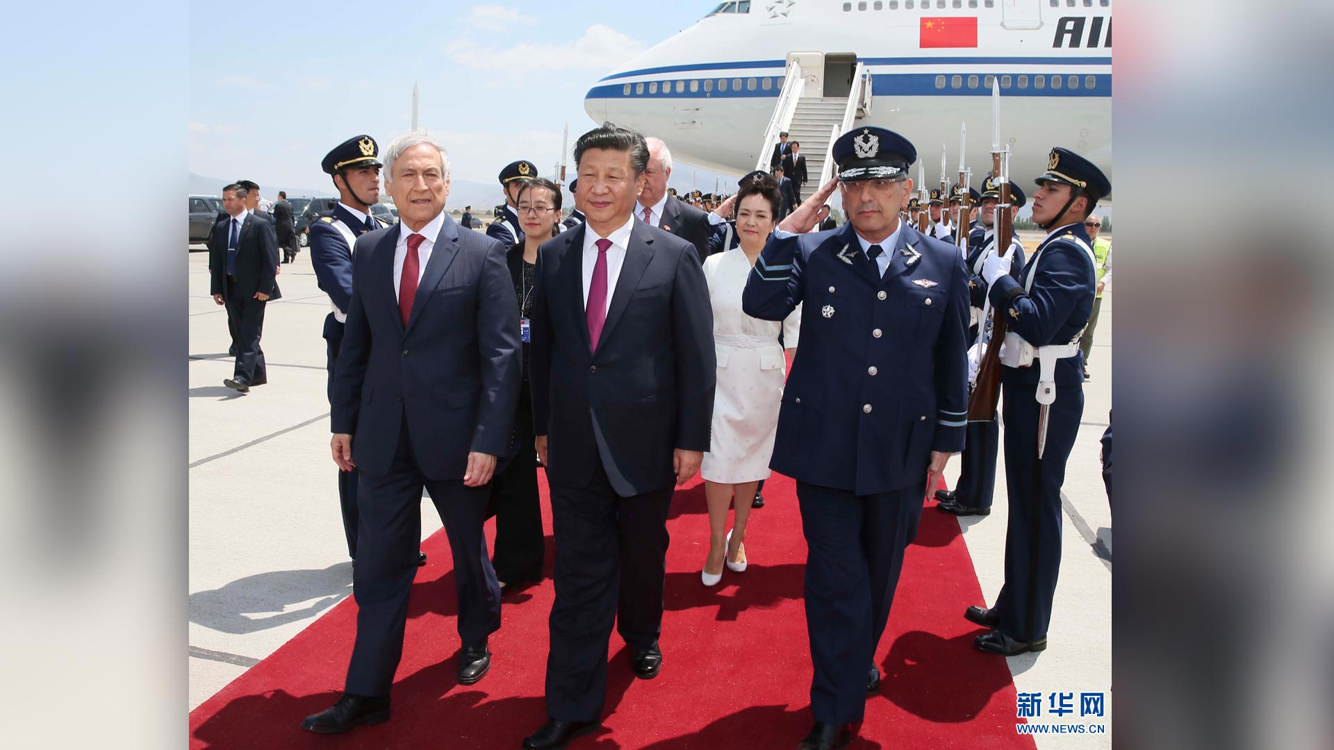 11月22日,國家主席習(xí)近平抵達(dá)圣地亞哥,對(duì)智利共和國進(jìn)行國事訪問。智利外長穆尼奧斯等在機(jī)場迎接習(xí)近平和夫人彭麗媛。 新華社記者蘭紅光 攝2016-11-23