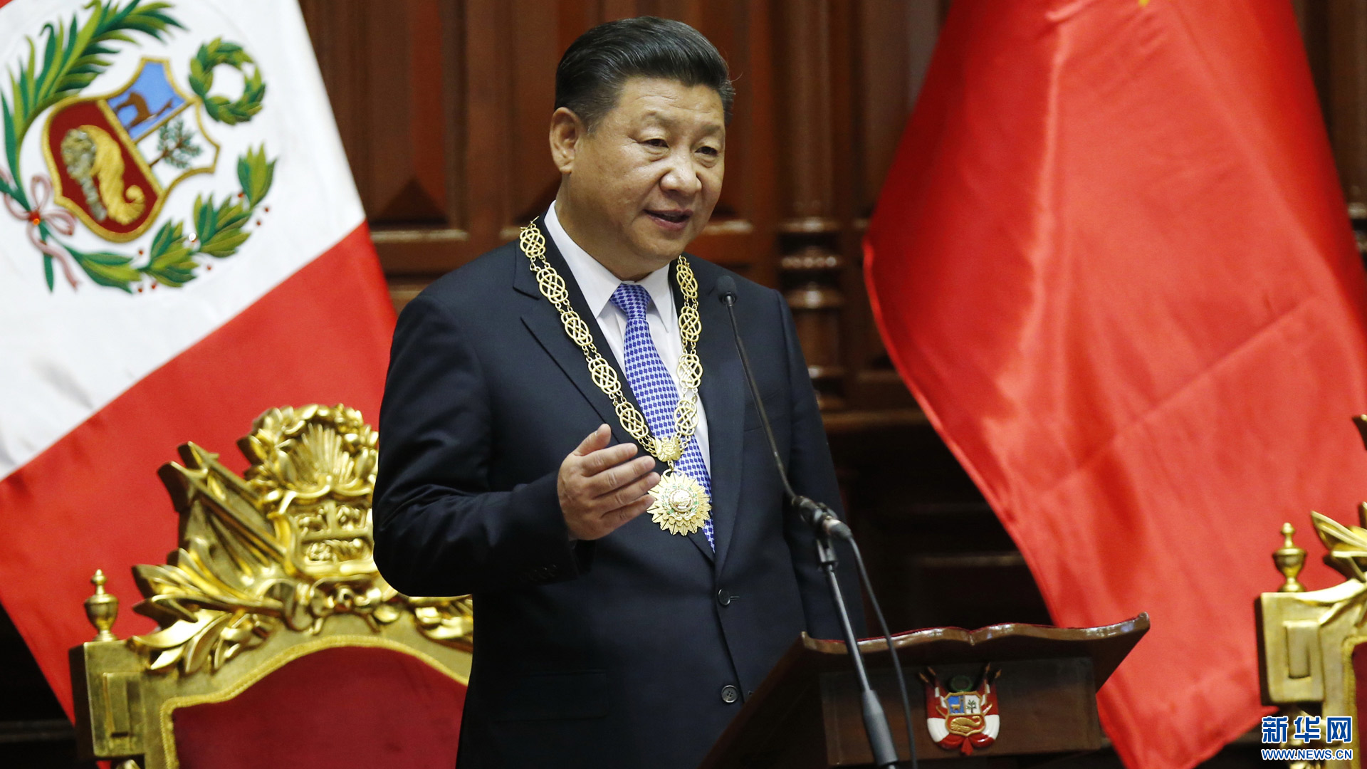 11月21日,國家主席習(xí)近平在秘魯國會(huì)發(fā)表題為《同舟共濟(jì)、揚(yáng)帆遠(yuǎn)航,共創(chuàng)中拉關(guān)系美好未來》的重要演講。 新華社記者 鞠鵬 攝2016-11-22