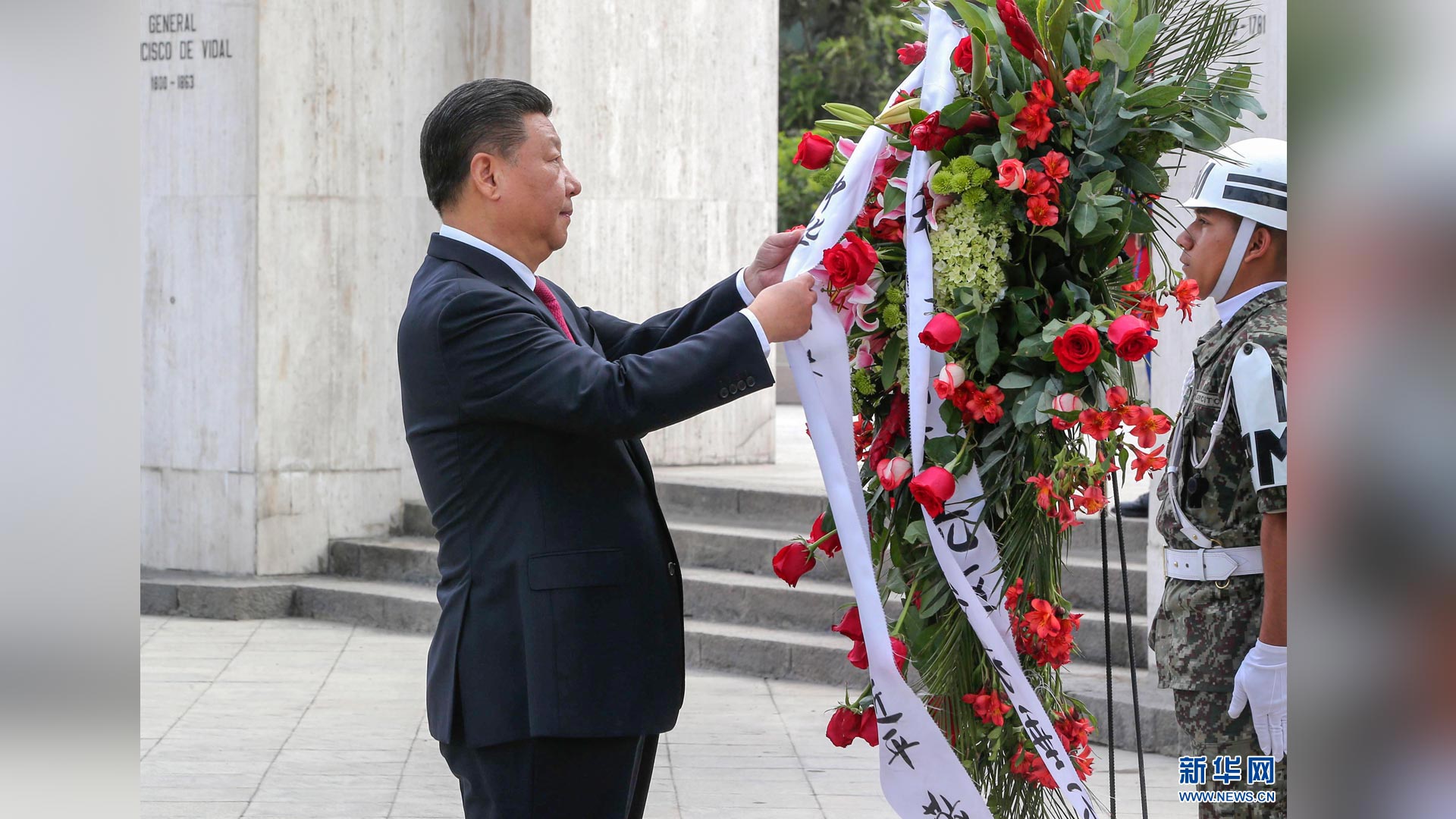11月22日,國家主席習(xí)近平在圣地亞哥向智利解放者奧希金斯紀(jì)念碑敬獻(xiàn)花圈。 新華社記者 黃敬文 攝2016-11-23