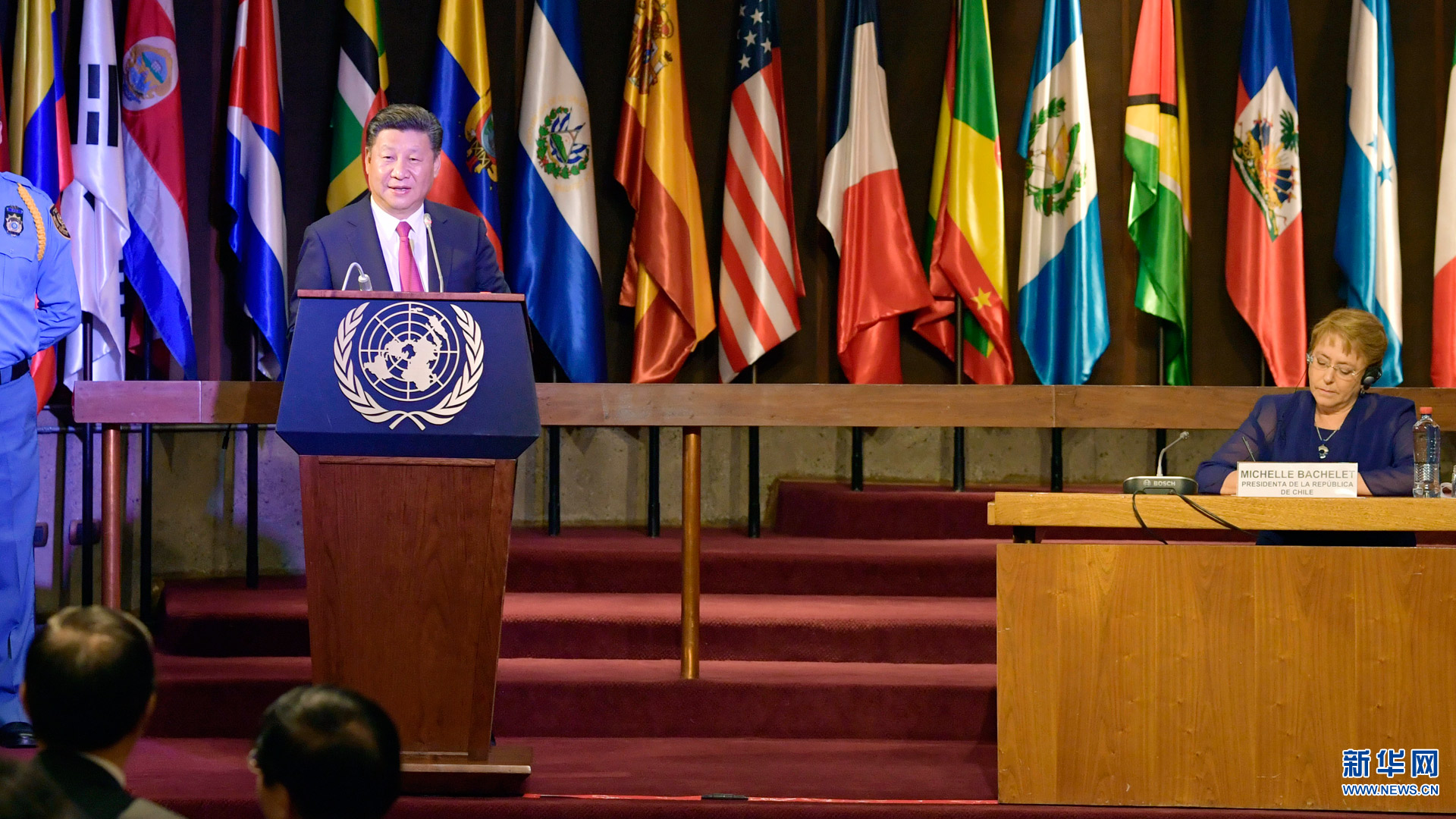 11月22日,國家主席習(xí)近平在圣地亞哥聯(lián)合國拉丁美洲和加勒比經(jīng)濟(jì)委員會(huì)總部出席中拉媒體領(lǐng)袖峰會(huì)開幕式。智利總統(tǒng)巴切萊特陪同出席。在熱烈的掌聲中,習(xí)近平發(fā)表題為《開創(chuàng)中拉媒體合作新局面》的致辭。新華社記者 鞠鵬 攝2016-11-23