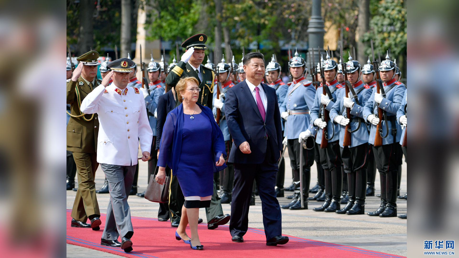 11月22日,國家主席習(xí)近平在圣地亞哥同智利總統(tǒng)巴切萊特舉行會(huì)談。這是會(huì)談前,習(xí)近平出席巴切萊特在憲法廣場舉行的隆重歡迎儀式。新華社記者 王曄 攝2016-11-23
