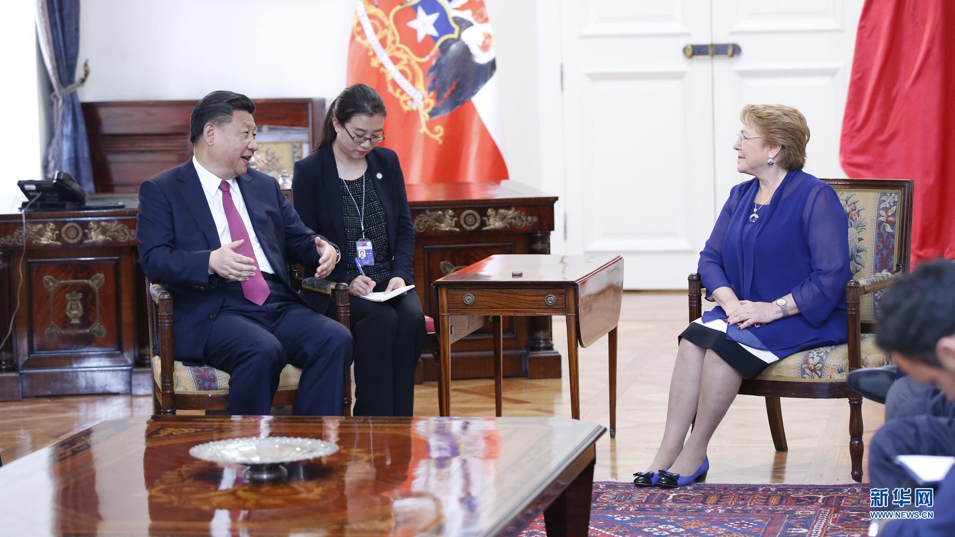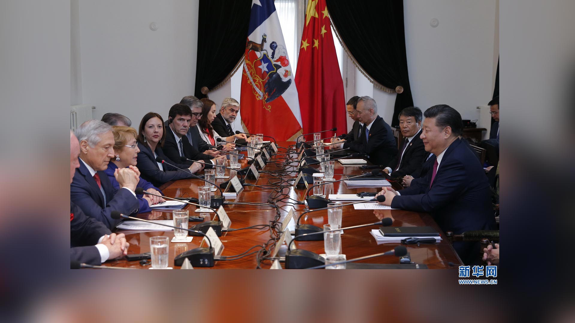 11月22日,國家主席習(xí)近平在圣地亞哥同智利總統(tǒng)巴切萊特舉行會(huì)談。 新華社記者 鞠鵬 攝2016-11-23