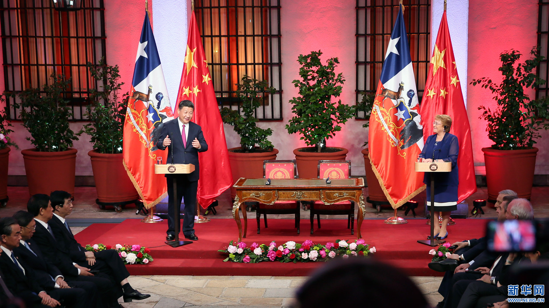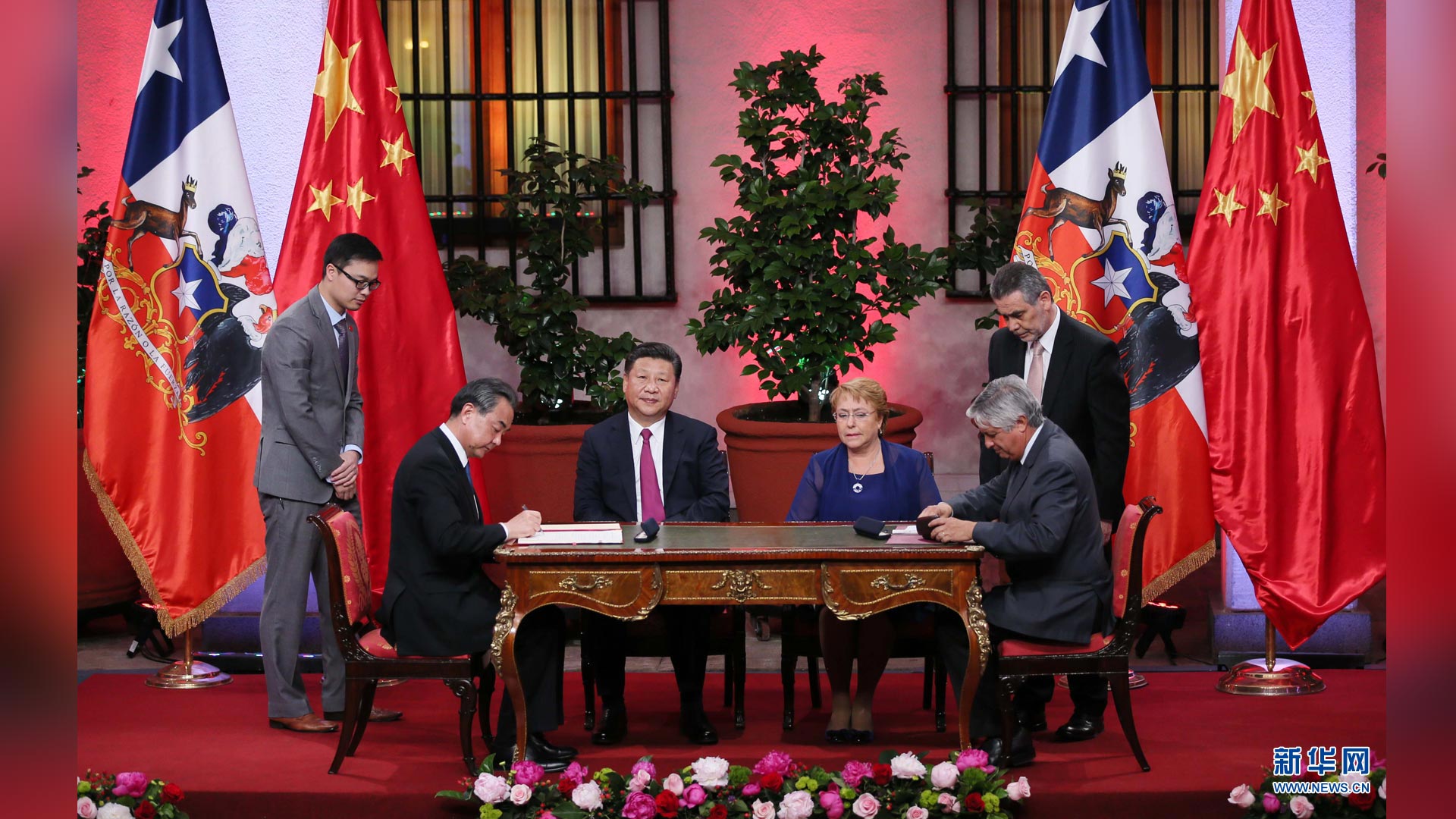 11月22日,國家主席習(xí)近平在圣地亞哥同智利總統(tǒng)巴切萊特舉行會(huì)談。這是會(huì)談后,兩國元首見證經(jīng)貿(mào)、農(nóng)業(yè)、質(zhì)檢、文化、教育、電子商務(wù)、信息通信、金融等領(lǐng)域多項(xiàng)雙邊合作文件的簽署。新華社記者 蘭紅光 攝2016-11-23