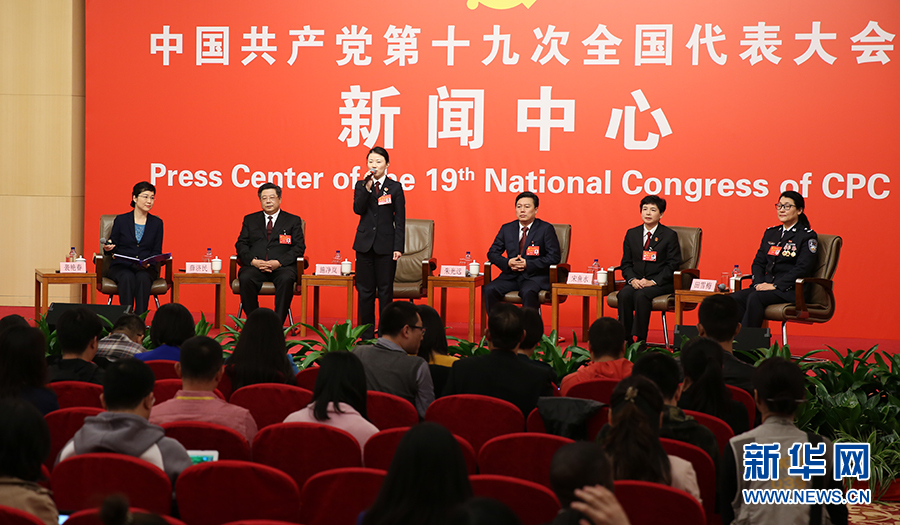 ??? 10月19日,十九大新聞中心舉辦集體采訪,邀請(qǐng)政法戰(zhàn)線代表談全面推進(jìn)依法治國(guó)。圖為采訪現(xiàn)場(chǎng)。新華網(wǎng) 郝廣鵬攝