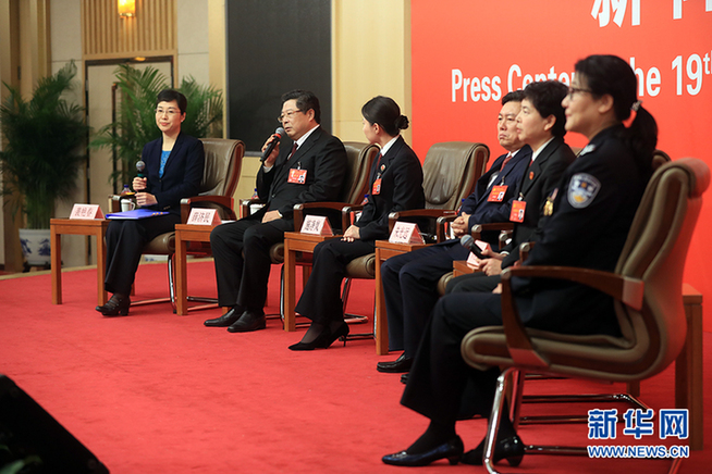 ??? 10月19日,十九大新聞中心舉辦集體采訪,邀請政法戰線代表談推進全面依法治國。圖為采訪現場。新華網 郝廣鵬攝