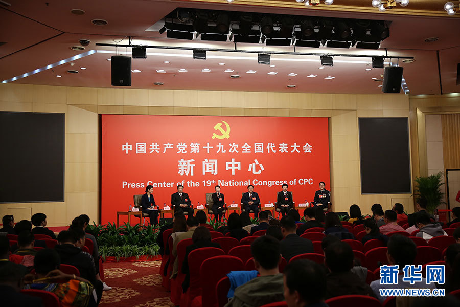 ??? 10月19日,十九大新聞中心舉辦集體采訪,邀請政法戰線代表談全面推進依法治國。圖為采訪現場。新華網 郝廣鵬攝