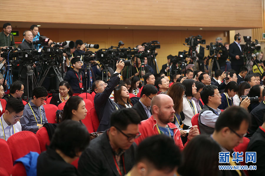 ??? 10月21日,十九大新聞中心舉辦記者招待會,邀請中共中央統(tǒng)戰(zhàn)部常務(wù)副部長張裔炯、副部長冉萬祥,中共中央對外聯(lián)絡(luò)部副部長郭業(yè)洲介紹黨的統(tǒng)一戰(zhàn)線工作和黨的對外交往情況,并回答記者提問。圖為現(xiàn)場記者。新華網(wǎng) 郝廣鵬攝