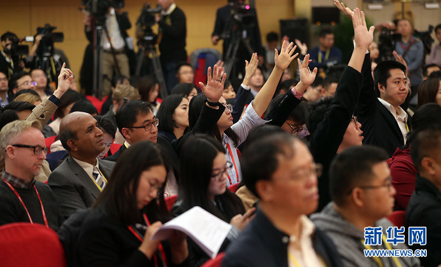 10月21日,十九大新聞中心舉辦記者招待會,邀請中共中央統戰部常務副部長張裔炯、副部長冉萬祥,中共中央對外聯絡部副部長郭業洲介紹黨的統一戰線工作和黨的對外交往情況,并回答記者提問。圖為現場記者。新華網 郝廣鵬攝