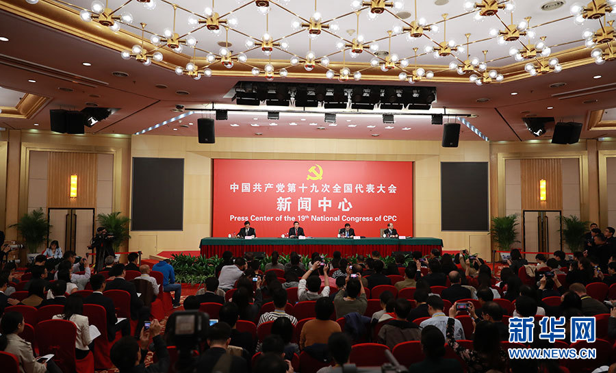 ??? 10月21日,十九大新聞中心舉辦記者招待會,邀請國家發展改革委黨組書記、主任何立峰,副主任張勇,副主任寧吉喆介紹以新發展理念為引領,推進中國經濟平穩健康可持續發展有關情況,并回答記者提問。圖為記者招待會現場。新華網 郝廣鵬攝