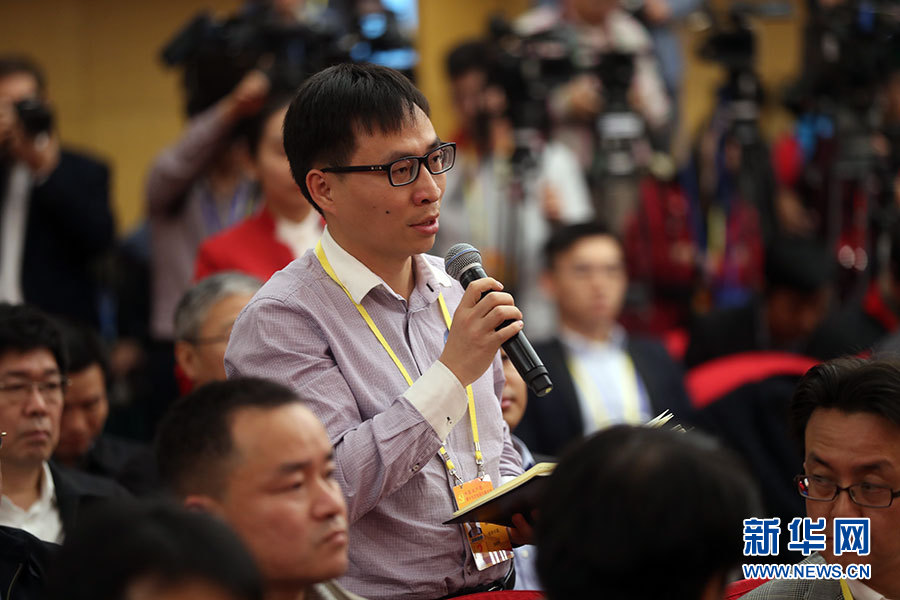 10月21日,十九大新聞中心舉辦記者招待會,邀請國家發展改革委黨組書記、主任何立峰,副主任張勇,副主任寧吉喆介紹以新發展理念為引領,推進中國經濟平穩健康可持續發展有關情況,并回答記者提問。圖為經濟日報記者提問。新華網 郝廣鵬攝