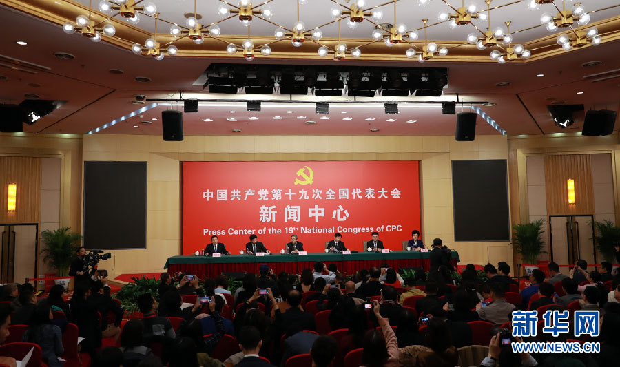 10月22日,十九大新聞中心舉辦記者招待會,邀請教育部黨組書記、部長陳寶生,民政部黨組書記、部長黃樹賢,人力資源社會保障部黨組書記、部長尹蔚民,住房城鄉建設部黨組書記、部長王蒙徽,國家衛生計生委黨組書記、主任李斌介紹滿足人民新期待,保障改善民生有關情況,并回答記者提問。圖為記者招待會現場。新華網 郝廣鵬攝