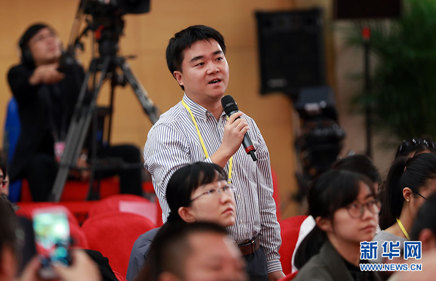 10月23日,十九大新聞中心舉辦集體采訪活動,主題為“打好生態(tài)環(huán)保攻堅戰(zhàn)”。圖為中國國際廣播電臺記者提問。新華網(wǎng) 郝廣鵬攝