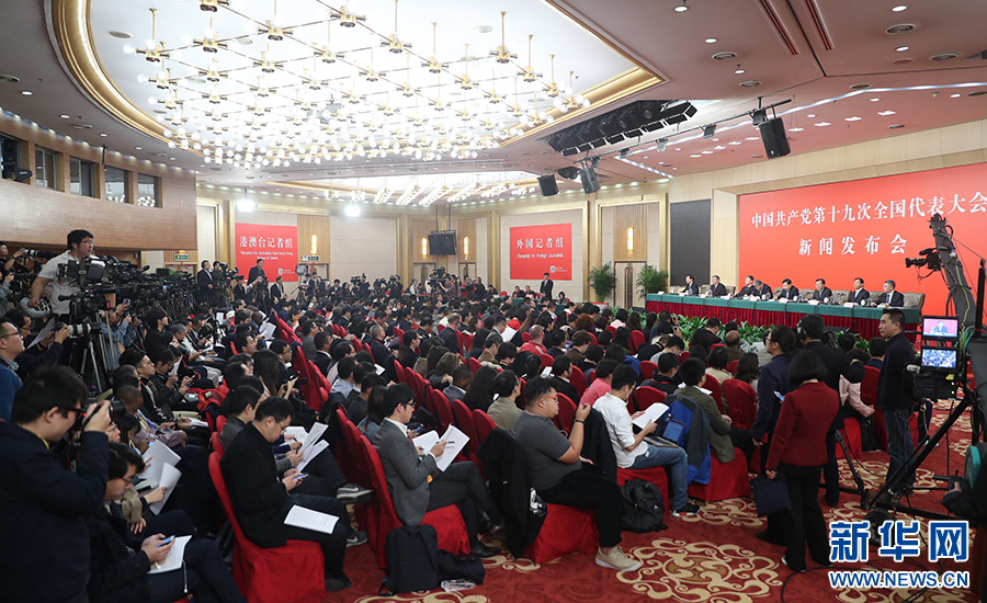 10月26日上午10:00,中國共產黨第十九次全國代表大會新聞發言人在梅地亞賓館二層新聞發布廳召開專題新聞發布會,請有關方面負責人解讀十九大報告,并回答記者關心的問題。圖為新聞發布會現場。新華網 王翰林 攝
