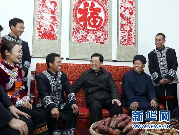 ????12月1日至6日,國家主席胡錦濤在貴州考察工作。這是胡錦濤在畢節市黔西縣烏騾壩村親切看望布依族村民潘安平一家。 新華社記者 鞠鵬 攝