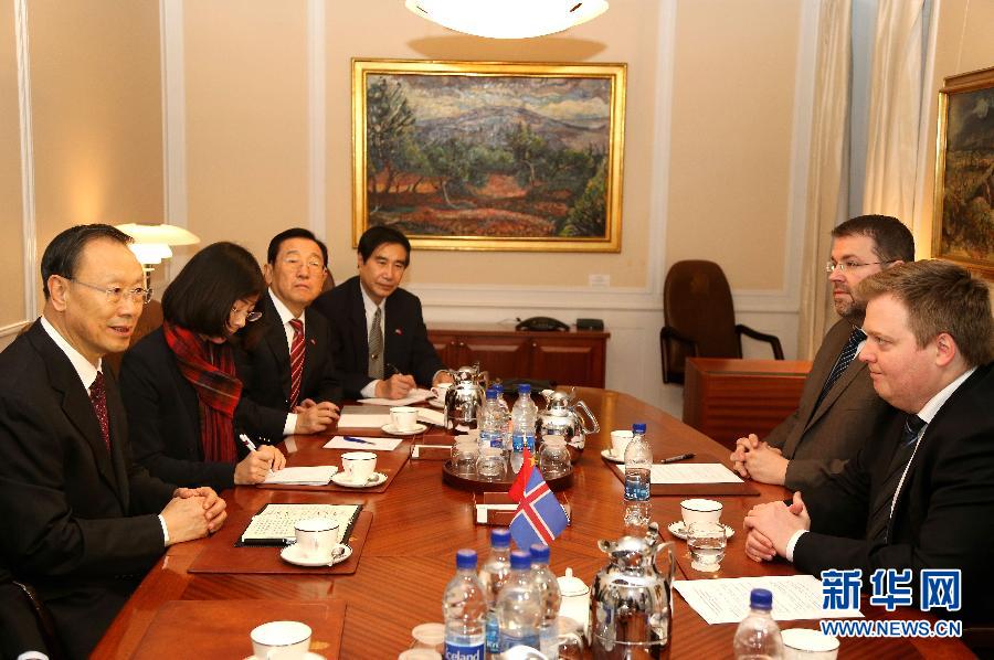 ??? 11月14日,在冰島首都雷克雅未克,中央書記處書記、全國政協副主席杜青林(左一)與冰島總理京勒伊格松(右一)舉行會談。新華社記者黃曉南攝