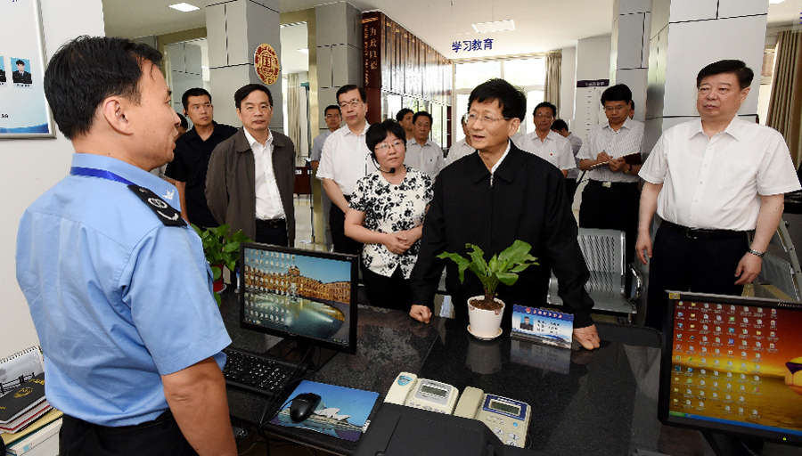 6月13日至17日,中共中央政治局委員、中央政法委書記孟建柱在山東調(diào)研。圖為6月13日,孟建柱來到曲阜市司法局社區(qū)矯正管理中心調(diào)研。