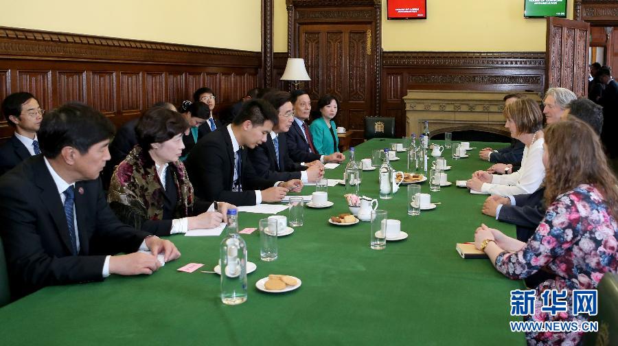 ??? 6月19日,在英國倫敦,中共中央政治局委員、北京市委書記郭金龍(左排,右三)會見工黨代領袖哈曼。應英國政府邀請,中共中央政治局委員、北京市委書記郭金龍于18日至22日率中共代表團對英國進行友好訪問。期間,郭金龍會見了商務、創新和技能大臣賈維德,蘭開斯特公爵郡大臣萊特溫,約克公爵安德魯王子,工黨代領袖哈曼,倫敦市長約翰遜,倫敦金融城市長亞羅,蘇格蘭政府首席大臣、蘇格蘭民族黨領袖斯特金等。新華社記者 韓巖 攝