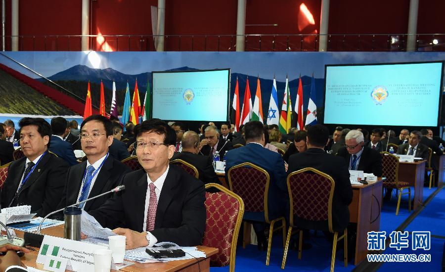 ??? 6月25日,中共中央政治局委員、中央政法委書記孟建柱(前右)出席在俄羅斯烏蘭烏德舉行的第六屆安全事務高級代表國際會議。中共中央政治局委員、中央政法委書記孟建柱24日至25日出席在俄羅斯烏蘭烏德舉行的第六屆安全事務高級代表國際會議。來自近70個國家和國際組織的代表圍繞加強國際協作,共同打擊極端勢力和恐怖主義進行深入討論,達成重要共識。新華社記者賈宇辰攝