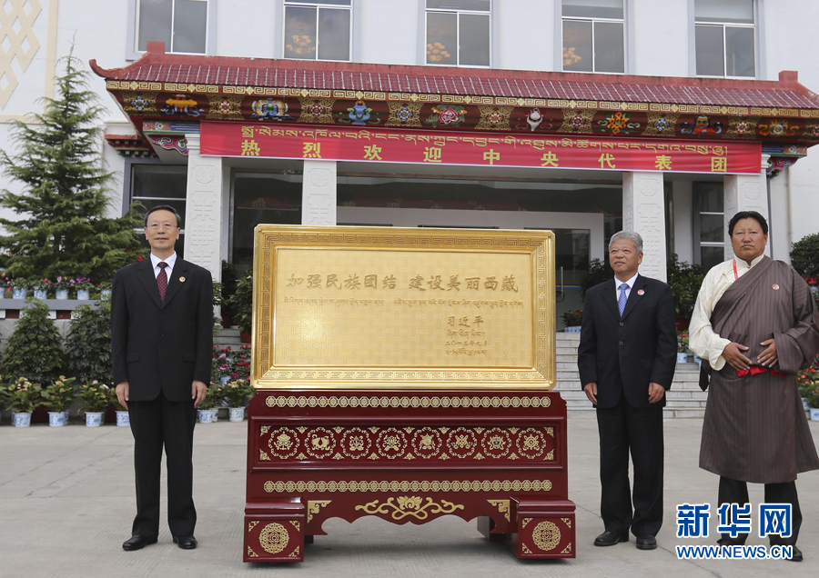 ??? 9月9日至10日,中央書記處書記、全國政協副主席、中央代表團副團長杜青林率林芝分團,帶著以習近平同志為總書記的黨中央對西藏各族人民的深切關懷和全國人民的美好祝福,看望慰問當地各族干部群眾。這是9月10日,杜青林向林芝市贈送習近平總書記題詞“加強民族團結 建設美麗西藏”賀匾。 新華社記者丁林攝