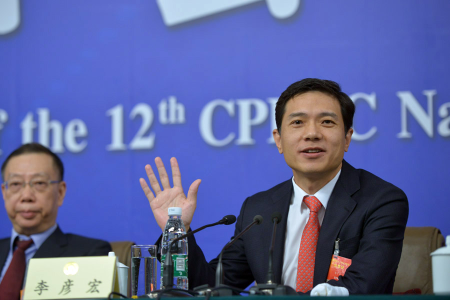 ??? 全國政協十二屆三次會議舉行記者會,邀請全國政協常委朱維群、黃潔夫和全國政協委員胡曉義、李彥宏、俞敏洪等談促進民生改善與社會和諧穩定,并回答記者提問。圖為李彥宏答記者問。新華網/中國政府網 郭小天 攝