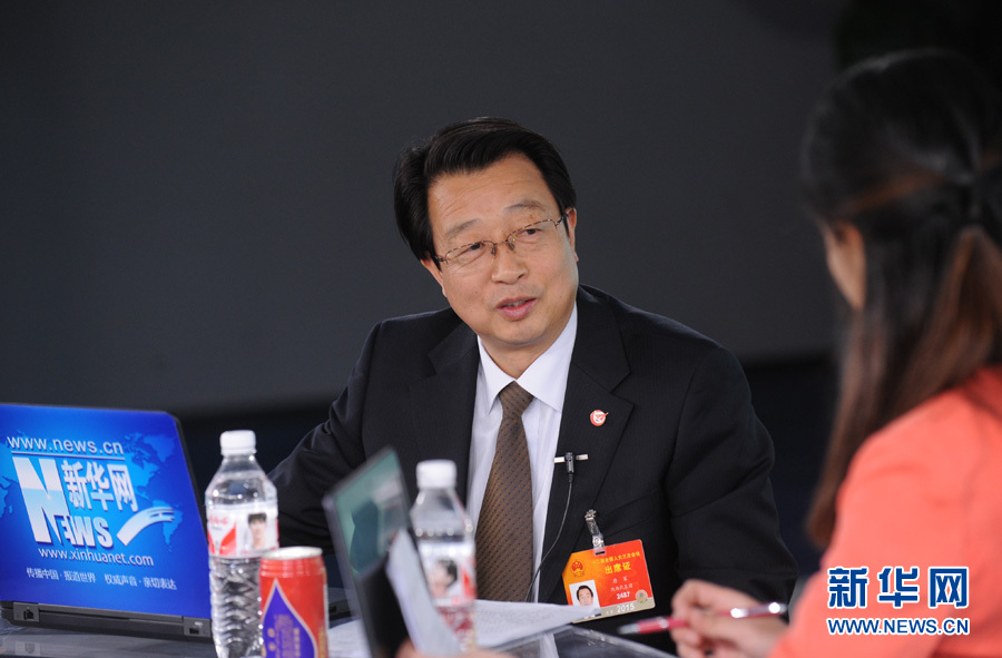 2015年3月13日,全國人大代表、中航飛機股份有限公司總經理唐軍做客新華網,就航空制造業面臨的機遇和挑戰與廣大網友展開交流。圖為唐軍與主持人交談。 新華網 陳競超 攝