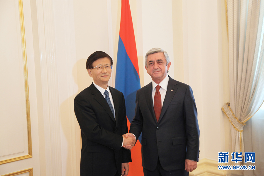 ?? ?5月21日,亞美尼亞總統(tǒng)薩爾基相在首都埃里溫會見到訪的習(xí)近平主席特使、中共中央政治局委員、中央政法委書記孟建柱。 新華社記者李銘攝