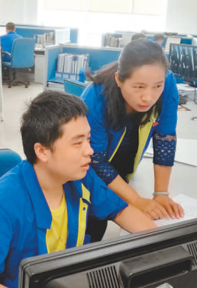 姜妍(右)在指導員工修改設計。本報記者 何 勇攝