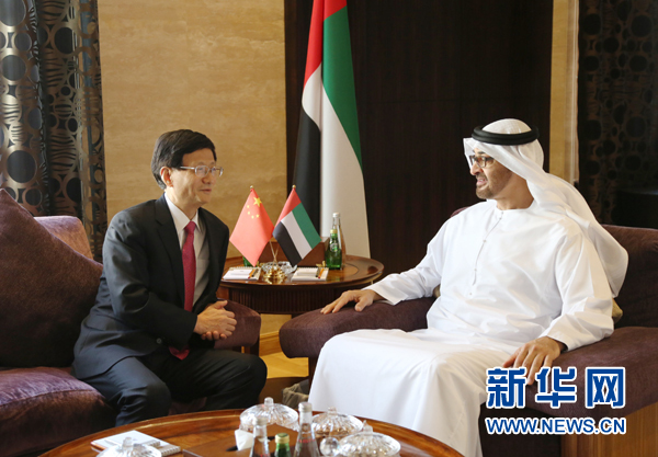 11月7日,在阿聯(lián)酋阿布扎比,習近平主席特使、中共中央政治局委員、中央政法委書記孟建柱(左)會見阿聯(lián)酋阿布扎比王儲穆罕默德。新華社記者李震攝
