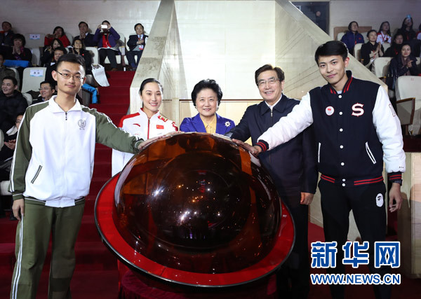 12月16日,國務院副總理劉延東,北京市委書記、北京冬奧組委主席郭金龍在北京首都體育館出席第三屆全國大眾冰雪季啟動儀式。 新華社記者王曄 攝