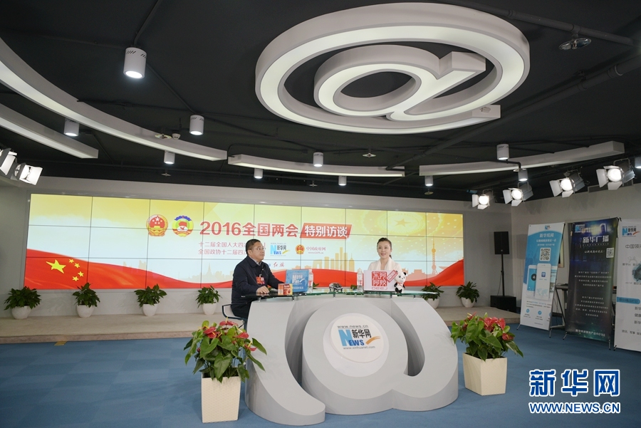2016年3月12日,全國人大代表、正邦集團董事局主席、總裁林印孫做客新華網兩會訪談直播間。圖為訪談現場。新華網 郭小天 攝