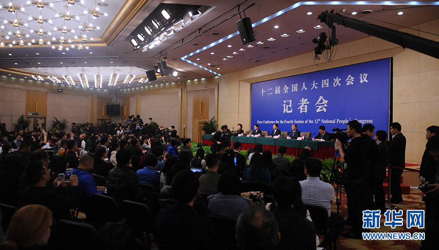 ?????十二屆全國人大四次會議新聞中心于3月12日(星期六)14時30分在梅地亞中心多功能廳舉行記者會,邀請國務院國有資產監督管理委員會主任肖亞慶、副主任張喜武、副主任黃丹華和副秘書長、新聞發言人彭華崗就“國企改革”的相關問題回答中外記者的提問。圖為記者會現場。新華網/中國政府網? 陳杰? 攝