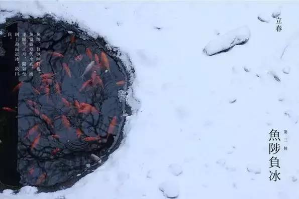 再過五日,河里的冰開始融化,魚開始到水面上游動,此時水面上還有沒完全溶解的碎冰片,如同被魚負著一般浮在水面。