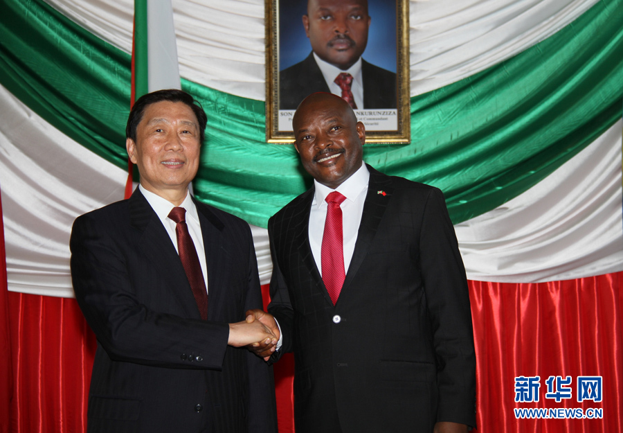 ??? 5月11日,布隆迪總統恩庫倫齊扎(右)在布瓊布拉會見到訪的中國國家副主席李源潮。新華社記者呂天然攝