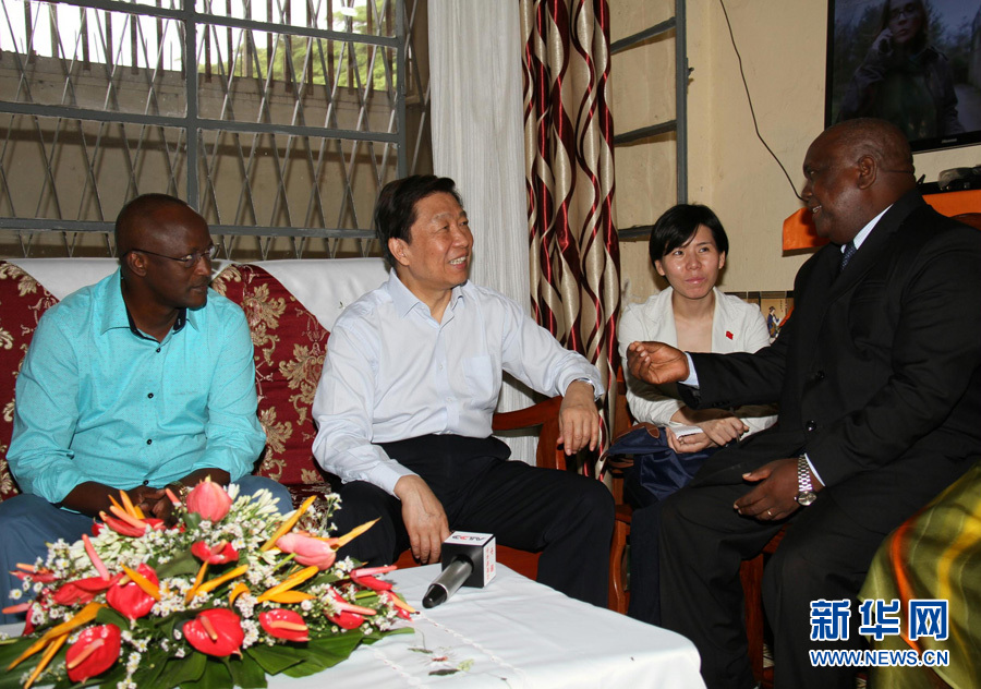 ??? 5月12日,在布隆迪首都布瓊布拉,正在布隆迪訪問的中國國家副主席李源潮(左二)在布第一副總統(tǒng)辛迪姆沃(左一)陪同下,專門來到布隆迪大學教授勞塞夫(右一)家中走訪,受到了勞塞夫一家的熱情歡迎和接待。新華社記者呂天然攝