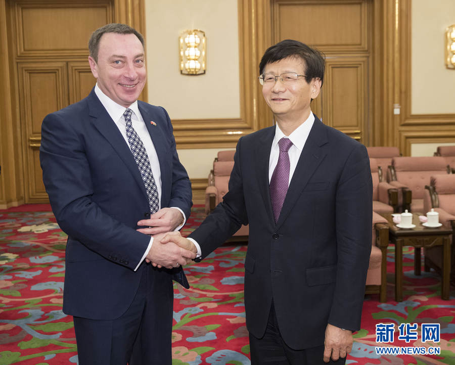 5月13日,中共中央政治局委員、中央政法委書記、中白政府間合作委員會中方主席孟建柱在北京中南海會見白俄羅斯總統辦公廳副主任、中白政府間合作委員會白方主席斯諾普科夫。新華社記者 丁林 攝