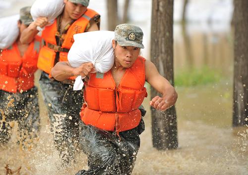 2013年8月17日,黑龍江省軍區預備役高炮師官兵在大慶市肇源縣超等鄉“駱駝脖子”江段抗洪。新華社發(呂衍海 攝)