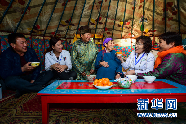 家庭責任醫務人員與阿巴嘎旗牧民道力格爾瑪一家拉家常(2月20日攝)。為緩解牧民看病難問題,從2013年起,阿巴嘎旗給超出衛生院服務半徑10公里的每戶牧民配備小藥箱,安排家庭責任醫生,還購買了12臺內置B超機、心電圖機、尿液分析儀等醫療設備的流動服務車。新華社記者 連振 攝
