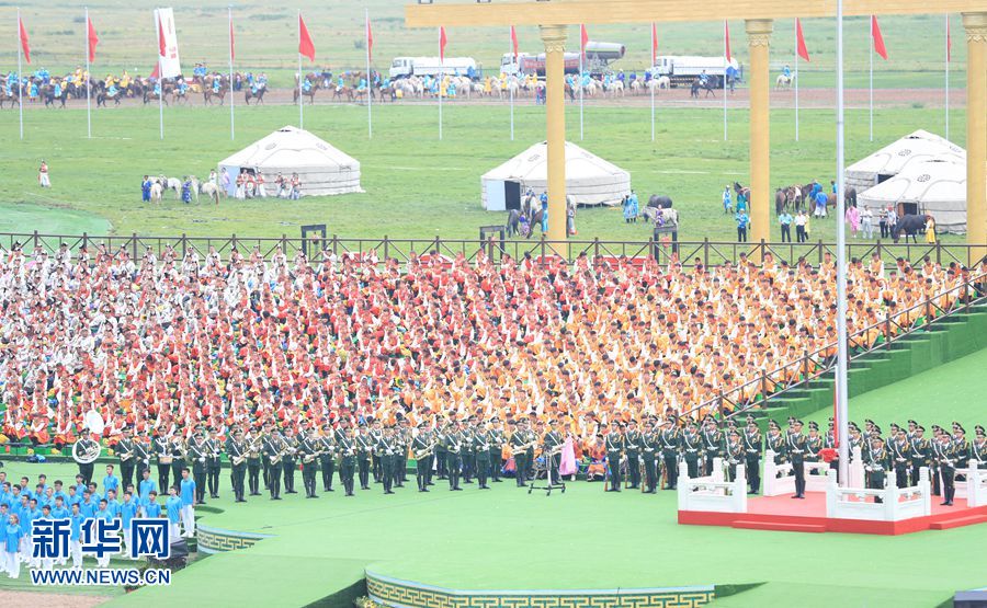 8月8日,內蒙古自治區成立70周年慶祝大會在呼和塔拉內蒙古少數民族群眾文化體育運動中心舉行。圖為升國旗儀式。新華網記者 陳杰 攝