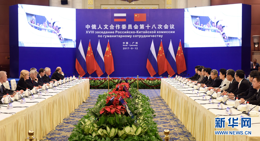 9月12日,中國國務院副總理、中俄人文合作委員會中方主席劉延東在廣州與俄羅斯副總理、委員會俄方主席戈洛杰茨共同主持召開中俄人文合作委員會第十八次會議。新華社記者 盧漢欣 攝