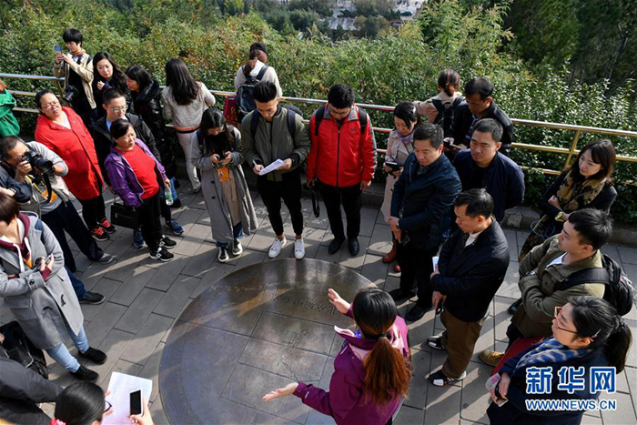 10月12日,記者團在景山公園北京城中心點參觀。新華社記者 李鑫 攝