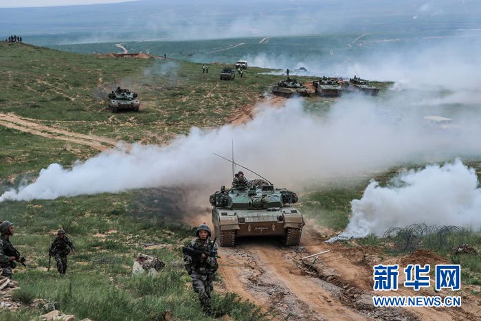 “跨越-2016·朱日和A”演習(xí)進(jìn)入實兵對抗陣地進(jìn)攻戰(zhàn),這是紅藍(lán)雙方首場對抗中紅軍步兵和坦克協(xié)同(2016年7月19日攝)。新華社發(fā)(王佳寅 攝)