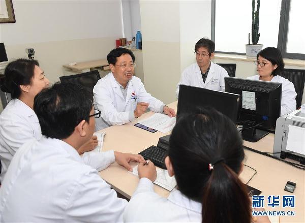 張銘連(中)在河北省眼科醫院向醫生宣講十九大精神(10月28日攝)。新華社記者 牟宇 攝