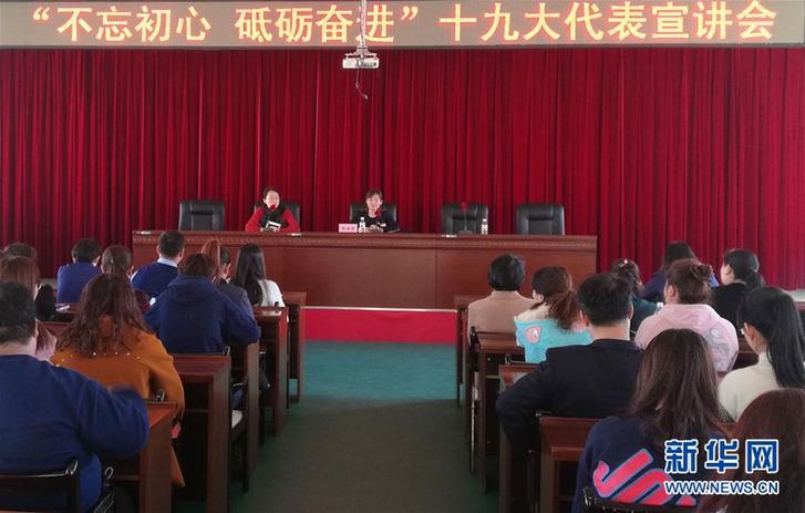黨的十九大代表、哈爾濱市道里區撫順街道撫順社區黨委書記郝麗影(前排右)在撫順街道辦宣講十九大精神(11月1日攝)。新華社發
