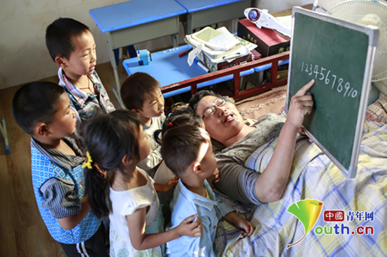 由于葉海濤的雙下肢關節僵直,沒有辦法筆直地坐著,他便躺在病床上,側著身子用小黑板給孩子們講解題目??墒沁@樣一來,躺的時間一旦久了,葉海濤的身體便會全都麻木,疼痛難忍。但他卻始終堅持著……最難熬的是夏季,他睡在板床上長時間保持同一個姿勢,全身都被汗水浸透了,額頭上黃豆般大小的汗珠不斷地冒出,滾落到板床上,床面已經被浸濕。常人都難以忍受,更何況是患病在床的葉海濤呢?在這種異常難受的狀態下,葉海濤憑借自己驚人的毅力,克服困難,十八年如一日,堅持為孩子們輔導功課。這份教學工作,是繁雜的,須深入學習、不斷鉆研,研究教學思路。為了更好地勝任這份輔導任務,他經常在空余時間閱讀有關教育方面的書籍。