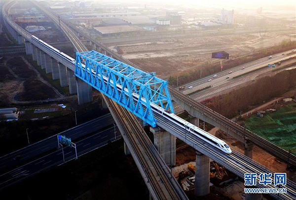 西成高鐵由西安北站駛出的列車經過西成高鐵跨西寶高鐵特大橋(12月6日攝)。新華社記者 劉瀟 攝