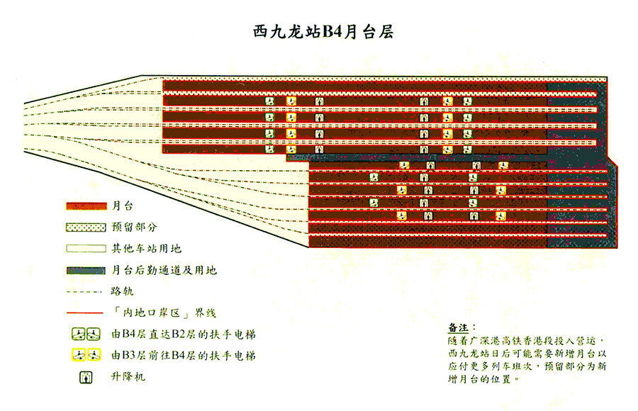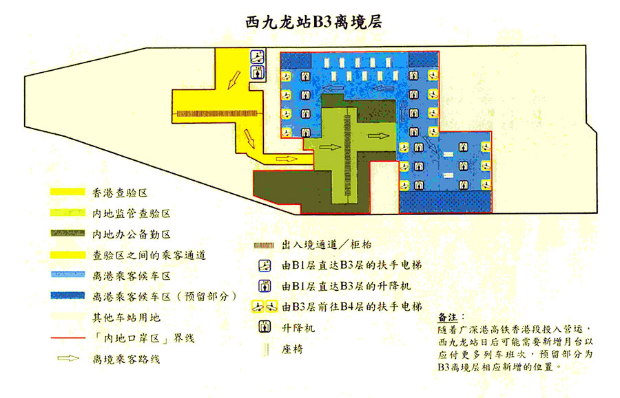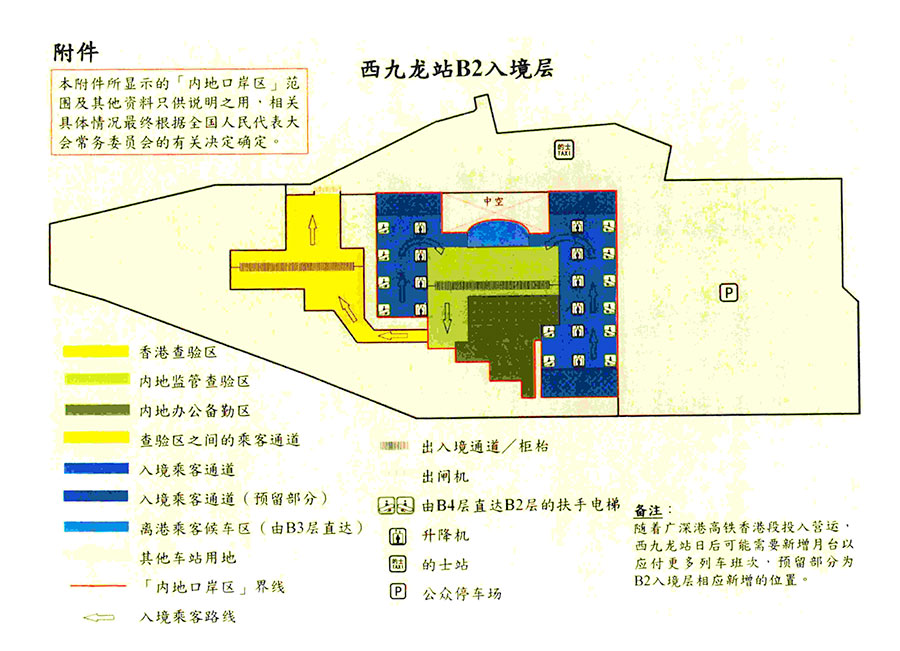 第二條 內地口岸區的范圍為西九龍站地下二、三層的劃定區域、地下四層月臺區域及有關連接通道,包括內地監管查驗區、辦公備勤區、離港乘客候車區、車站月臺和連接通道及電梯。內地口岸區范圍的詳情見附件。