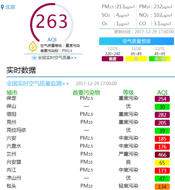 ??? 12月28日,華北黃淮等地迎來霾天氣過程。晚18時,北京市發(fā)布空氣重污染藍色預警,污染范圍為2017年冬季之最。