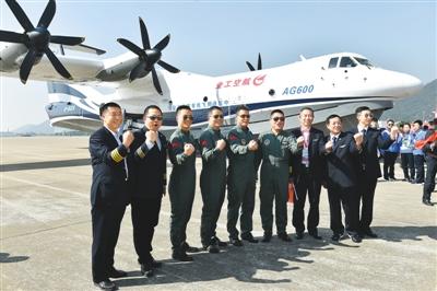 AG600完成首飛后,機組人員等與飛機合影留念 新華社記者 梁旭攝